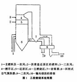 二十世紀80年代末至90年代初,美國、日本和前蘇聯幾乎同時開展了低NOX燃燒技術的開發研究。推出一種稱“再燃”(Reburning)火炬燃燒技術。其實質是“三段”火炬燃燒(見圖1),獲得廣泛應用。該項技術包括向爐內輸進碳、氫化合物把爐內主燃燒區已生成的NOX強化還原。在缺氧燃燒區內形成含氮原子團(NH和CH)。主燃燒區在一般過量空氣系數下,輸進80%~90%燃料,保證燃料穩定點燃,剩下20%~10%的燃料(最好是高反應性煤或燃氣)由另裝噴嘴在空氣不足條件下輸進爐內。它與火焰相混燃燒,過量空氣系數降至0.9~0.95。三次風由裝在主燃燒器組上部的噴嘴射進爐內。最終把燃料燒透。檢驗結果表明:該系統能使NOX還原成N2。