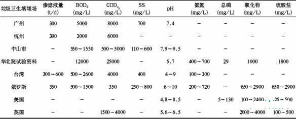 垃圾滲濾液中的CODcr一般達15000mg/L,BOD5一般達6000mg/L;垃圾滲濾液中含有10多種金屬離子,且氮多以氨氮形式存在,約占TKN(總凱氏氮)的40%~50%。國內外垃圾衛生填埋滲濾液水質情況見后表。
