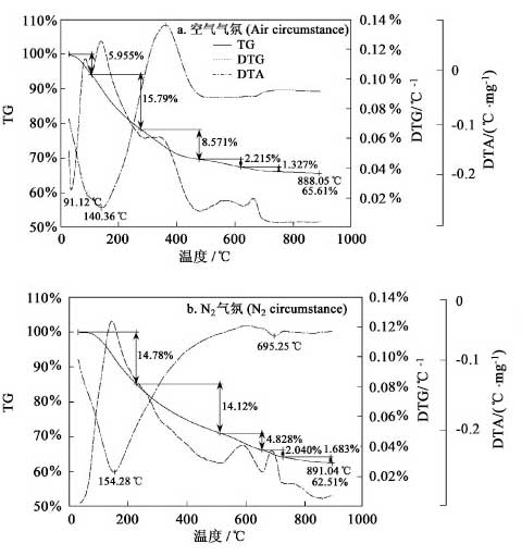 圖5 (a ,b) 分別(bie)是(shi)電(dian)鍍(du)污泥(ni)在(zai)空氣(qi)和N2 氣(qi)氛(fen)(fen)(fen)下的(de)熱(re)(re)重實驗結果. 在(zai)熱(re)(re)重試驗中, 空氣(qi)氣(qi)氛(fen)(fen)(fen)中的(de)120 ℃~400 ℃溫(wen)度(du)區間(jian)內(nei)DTG曲線(xian)(xian)存在(zai)兩個(ge)(ge)(ge)明(ming)顯的(de)失重峰(feng),且有一(yi)(yi)定的(de)重疊,而(er)N2 氣(qi)氛(fen)(fen)(fen)中的(de)相(xiang)(xiang)應(ying)溫(wen)度(du)區間(jian)內(nei)只出現1 個(ge)(ge)(ge),這一(yi)(yi)現象可從DTA 曲線(xian)(xian)得到(dao)解釋(shi). 空氣(qi)氣(qi)氛(fen)(fen)(fen)中該溫(wen)度(du)區域(yu)內(nei)有1 個(ge)(ge)(ge)吸(xi)熱(re)(re)峰(feng)和1 個(ge)(ge)(ge)放熱(re)(re)峰(feng),分別(bie)在(zai)140 ℃和361 ℃;與此相(xiang)(xiang)反(fan),N2 氣(qi)氛(fen)(fen)(fen)中該溫(wen)度(du)區域(yu)內(nei)只有1 個(ge)(ge)(ge)吸(xi)熱(re)(re)峰(feng),在(zai)154 ℃. 這是(shi)電(dian)鍍(du)污泥(ni)在(zai)空氣(qi)氣(qi)氛(fen)(fen)(fen)中發生了(le)氧(yang)化反(fan)應(ying),放出熱(re)(re)量(liang);而(er)由于在(zai)N2 氣(qi)氛(fen)(fen)(fen)中不(bu)存在(zai)放熱(re)(re)反(fan)應(ying),只有物料升(sheng)溫(wen)過程(cheng)的(de)吸(xi)熱(re)(re),所以整個(ge)(ge)(ge)過程(cheng)表(biao)現為吸(xi)熱(re)(re)反(fan)應(ying).
