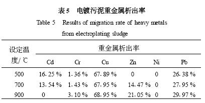 式中: R 為析出率; Am 為渣(zha)中的(de)重(zhong)金屬(shu)(shu)含量,mg·L - 1 ; Cm為電鍍污泥中的(de)重(zhong)金屬(shu)(shu)含量,mg·L - 1 .表5 是焚燒溫(wen)度對電鍍污泥中重(zhong)金屬(shu)(shu)析出特性(xing)的(de)影響(xiang)結果。