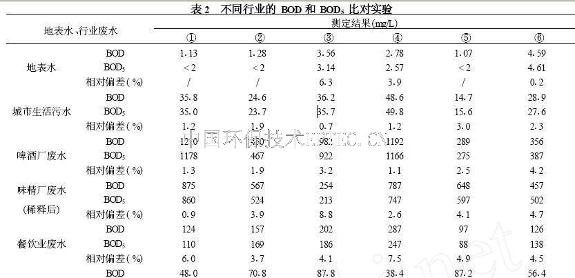 在保證實驗室質量控制體系的情況下,對地表水、不同行業的生活污水和工業廢水進行大量的BOD 微生物傳感器快速測定法(HJ86 - 2002)和BOD5 稀釋接種法( GB7488 - 1987) 的比對實驗,結果見表2。