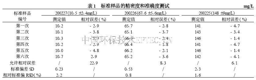 連續測定20 次空白溶液,按美國EPA SW -846 中規定方法檢出限計算方法MDL = 3.143SD(SD 為空白平行測定(批內) 標準偏差(重復測定7 次) ) ,得方法檢出限為0.5mgPL 。