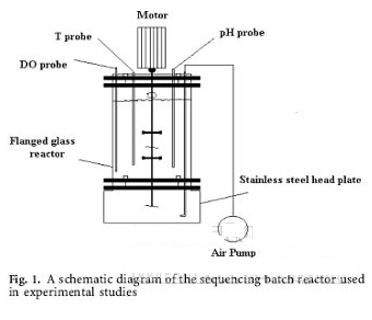 圖1為試驗裝置簡圖。5L的發酵罐(Bioflo IIC, New Brunswick)作為SBR反應器。發酵罐通過微電腦控制通氣、pH和溶氧(DO)。通過帶有曝氣透的空氣泵進行曝氣。攪拌速率在25 和300 rpm (rev min-1)。營養液中的pH 和 DO濃度通過相應的電極來連續監測。