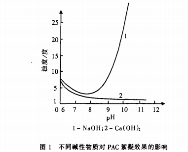 ③若廢水的(de)高pH值(zhi)是由Ca(OH)2引起的(de),則在pH=6~12時不(bu)影響PAC的(de)絮凝效果(guo)。不(bu)同(tong)堿性物質對PAC絮凝效果(guo)的(de)影響見(jian)圖1。