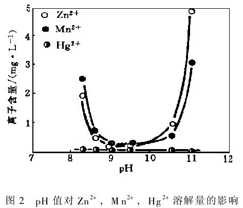 由圖2可知,在pH為8.0時,Zn2+,Mn2+在水中的含量較高。隨著pH值的增大,其含量逐漸變低,在pH為9.0時,Zn2+,Mn2+含量分別為0.10,0.15mg/L。.pH值繼續增大,Zn2+,Mn2+離子反而逐漸增高,當pH為11.0時,Zn2+,Mn2+離子含量增加到5.0,3.0mg/L。產生這種情況的原因是由于Zn2+,Mn2+離子的氫氧化物能在OH-離子濃度較大的情況下生成相應的配位陰離子Zn(OH)-3和Mn(OH)-3。.這些離子的溶度積分別為3×10-3及1×10-5,說明溶解度增大,使水液中的Zn2+,Mn2+含量增加,而Hg2+離子不具有這種性質,因此其含量較為穩定。