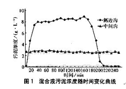 利用便攜式光電污泥濃度儀(測量精度為0.1mg/L)對氧化溝正在運行的側邊溝(另一側邊溝正處于澄清狀態)和中間溝混合液連續采樣分析。由于三溝式氧化溝運行具有的對稱性,只進行半個運行周期(14h)的取樣分析即可。每隔10min進行一次測量,采樣點固定在液面下1m。試驗結果見圖1。