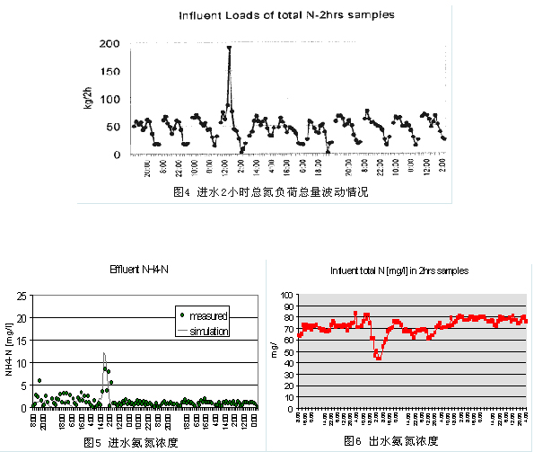 聯邦德國波茨坦(Potsdam)污水處理廠設計平均日處理量為21082 m3/d,最大設計小時流量為2490 m3/h。 在旱流流量條件下循環周期為4小時,在雨天流量下為3小時。系統共設4個C-TECH單元,內置于2個圓形池子中,每個池子的直徑為52m,最大設計水深為5.5m。由于該廠進水泵提升能力過大,對后續生物處理段造成很大的沖擊,其進水氮的負荷波動高達4倍以上,見圖4。