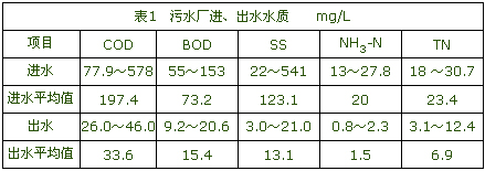 設計進水BOD為100~150 mg/L,COD為200~300 mg/L,SS為250 mg/L。設計出水水質達到《污水綜合排放標準》(GB 8978—1996)的一級標準。進、出水水質見表1。