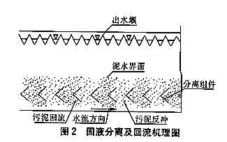 在分離器底部,混合液受到組件下側板的反力作用,該力可分解組件下側板流動的兩束流——上向流和下向流,因流速差的存在形成壓力差,該壓力差就直接導致了污泥自動回流。成都城北污水廠一年多的運行情況表明,只要保證固液分離器底部的推動力并及時排泥,就能 保證穩定的分離及回流效果。