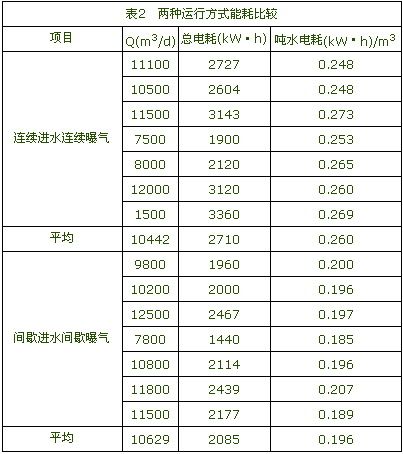 為進一步降低能耗,城北污水廠在日常還采取了優化運行的模式,即采取連續流間歇曝氣。該方式是讓曝氣轉刷周期性開啟,根據需要的溶解氧濃度調整周期,而水下推進器保持連續運行。現在該污水廠最常用的運行方式是保持1臺轉刷長期運行,另1臺以2 h為周期間歇運行。這種運行方式加快了好氧/缺氧的交替頻率,有利于整個系統的脫氮除磷。與連續進水、連續曝氣相比,其對COD與SS的處理效果略有下降,但均在達標范圍之內,即NO3-N基本不變,而TN和TP的去除效果均優于連續曝氣。這主要是因為系統的間歇運行能充分利用氧化溝中的內源代謝產物,進行預缺氧反硝化,脫除部分NO3-N,使前置缺氧段內的C/N提高,從而維持較高的反硝化速率。其次,間歇運行還能使溝中溶解氧的利用率得到提高,這是因為氧化溝是延時曝氣活性污泥系統,BOD負荷大大低于普通活性污泥法,活性污泥的能量水平低,故即使DO濃度值較低(低于2mg/L),也可使活性污泥絮體處于好氧狀態。另外,間歇曝氣的運行方式還可使系統內氧轉移速率增大,氧利用率高則為系統節能創造了條件。在達到同種處理要求的條件下,間歇曝氣比連續曝氣節能達22%左右, 兩種運行方式的能耗比較見表2。