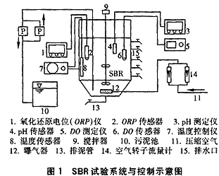 試(shi)驗裝置如圖1。反(fan)應器高為(wei)70 cm,直徑(jing)為(wei)30 cm,總有效容積(ji)為(wei)38 L,采用(yong)(yong)鼓風曝氣,用(yong)(yong)轉子流(liu)量計(ji)調節曝氣量。反(fan)應過程中在線(xian)檢測(ce)DO、ORP、pH值,并根據DO、ORP、pH的(de)變化在一定(ding)的(de)時間內取樣。檢測(ce)分析項目有:CODCr(重鉻酸鉀(jia)法),MLSS(濾(lv)紙重量法),DO、溫度(YSI MODEL 50B溶解(jie)氧測(ce)定(ding)儀),ORP(American Sensor Incorporation生產的(de)ORP復合電極(ji)),pH(pHS—3C型精密酸度計(ji)),SV%(100 mL量筒),NO2-N[N-(1-萘基)-乙二胺光度法],NO3-N(麝(she)香草(cao)酚分光光度法),NH3-N(納氏試(shi)劑光度法)。