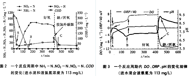 試(shi)驗方案:經過污泥(ni)馴化(hua)接種和培養,維(wei)持(chi)MLSS=8 000 mg/L左右,長期維(wei)持(chi)進水(shui)混(hun)合(he)(he)液(ye)CODCr在(zai)(zai)(zai)300~330 mg/L左右,磷足(zu)量,投加(jia)碳酸(suan)氫(qing)鈉調節pH在(zai)(zai)(zai)中性偏堿的(de)(de)(de)范圍之內;首先(xian)維(wei)持(chi)進水(shui)混(hun)合(he)(he)液(ye)NH3-N在(zai)(zai)(zai)一定的(de)(de)(de)濃(nong)度(du)(du)下運行一定的(de)(de)(de)周(zhou)期數,此試(shi)驗共進行了2個水(shui)平(ping):80~85 mg/L,110~120 mg/L,考(kao)察不同(tong)進水(shui)混(hun)合(he)(he)液(ye)氨氮濃(nong)度(du)(du)情況下DO、ORP、pH的(de)(de)(de)變化(hua)規律;然后模擬(ni)實際工程的(de)(de)(de)進水(shui)水(shui)質沖擊的(de)(de)(de)情況,對這(zhe)兩種穩態分別進行了以4種不同(tong)進水(shui)混(hun)合(he)(he)液(ye)NH3-N濃(nong)度(du)(du)作為初始沖擊氨氮濃(nong)度(du)(du),驗證硝化(hua)、反硝化(hua)過程的(de)(de)(de)DO、ORP、pH的(de)(de)(de)變化(hua)規律。