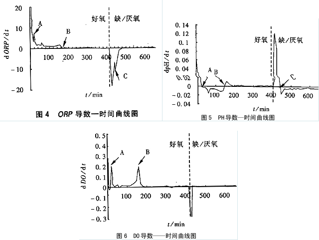 對(dui)(dui)(dui)應(ying)圖(tu)(tu)2、3給出上述典型過程中(zhong)(zhong)(zhong)ORP,DO,pH的(de)導(dao)(dao)數(shu)圖(tu)(tu)形(xing)(圖(tu)(tu)4、5、6)。在(zai)圖(tu)(tu)4中(zhong)(zhong)(zhong)可(ke)(ke)以(yi)清楚地(di)看(kan)到對(dui)(dui)(dui)應(ying)著COD降(jiang)(jiang)解(jie)(jie)的(de)結(jie)束(shu)(shu)以(yi)及硝(xiao)(xiao)(xiao)(xiao)(xiao)化(hua)(hua)反(fan)應(ying)的(de)結(jie)束(shu)(shu),ORP的(de)突躍(yue)點(dian)(dian)(dian)(dian)(dian)(圖(tu)(tu)4中(zhong)(zhong)(zhong)點(dian)(dian)(dian)(dian)(dian)A)和平臺出現的(de)時間點(dian)(dian)(dian)(dian)(dian)(圖(tu)(tu)4中(zhong)(zhong)(zhong)點(dian)(dian)(dian)(dian)(dian)B);在(zai)反(fan)硝(xiao)(xiao)(xiao)(xiao)(xiao)化(hua)(hua)過程中(zhong)(zhong)(zhong),反(fan)硝(xiao)(xiao)(xiao)(xiao)(xiao)化(hua)(hua)結(jie)束(shu)(shu)的(de)時間可(ke)(ke)由(you)ORP導(dao)(dao)數(shu)絕對(dui)(dui)(dui)值的(de)突然(ran)增加(圖(tu)(tu)4中(zhong)(zhong)(zhong)點(dian)(dian)(dian)(dian)(dian)C)來輕松(song)地(di)判斷。在(zai)圖(tu)(tu)5中(zhong)(zhong)(zhong)COD降(jiang)(jiang)解(jie)(jie)結(jie)束(shu)(shu),開(kai)始(shi)硝(xiao)(xiao)(xiao)(xiao)(xiao)化(hua)(hua)對(dui)(dui)(dui)應(ying)著的(de)pH導(dao)(dao)數(shu)由(you)正(zheng)變(bian)負(fu)(fu)(圖(tu)(tu)5中(zhong)(zhong)(zhong)點(dian)(dian)(dian)(dian)(dian)A),硝(xiao)(xiao)(xiao)(xiao)(xiao)化(hua)(hua)的(de)結(jie)束(shu)(shu)以(yi)及反(fan)硝(xiao)(xiao)(xiao)(xiao)(xiao)化(hua)(hua)的(de)結(jie)束(shu)(shu)分別對(dui)(dui)(dui)應(ying)著pH導(dao)(dao)數(shu)由(you)負(fu)(fu)變(bian)正(zheng)(圖(tu)(tu)5中(zhong)(zhong)(zhong)點(dian)(dian)(dian)(dian)(dian)B)和由(you)正(zheng)變(bian)負(fu)(fu)(圖(tu)(tu)5中(zhong)(zhong)(zhong)點(dian)(dian)(dian)(dian)(dian)C)。DO導(dao)(dao)數(shu)圖(tu)(tu)形(xing)中(zhong)(zhong)(zhong)對(dui)(dui)(dui)應(ying)著COD降(jiang)(jiang)解(jie)(jie)結(jie)束(shu)(shu)以(yi)及硝(xiao)(xiao)(xiao)(xiao)(xiao)化(hua)(hua)反(fan)應(ying)的(de)結(jie)束(shu)(shu)可(ke)(ke)見兩個(ge)明顯(xian)的(de)突躍(yue)點(dian)(dian)(dian)(dian)(dian)(圖(tu)(tu)6中(zhong)(zhong)(zhong)點(dian)(dian)(dian)(dian)(dian)A,B)指示這兩個(ge)反(fan)應(ying)的(de)結(jie)束(shu)(shu):DO導(dao)(dao)數(shu)圖(tu)(tu)形(xing)中(zhong)(zhong)(zhong)的(de)第三(san)個(ge)負(fu)(fu)值跳躍(yue)點(dian)(dian)(dian)(dian)(dian)是停止(zhi)曝(pu)氣、開(kai)始(shi)攪(jiao)拌(ban),反(fan)應(ying)器中(zhong)(zhong)(zhong)DO濃度迅(xun)速減少(shao)所(suo)致。通過對(dui)(dui)(dui)這三(san)個(ge)參數(shu)導(dao)(dao)數(shu)的(de)分析,可(ke)(ke)知由(you)ORP,DO,pH的(de)特征點(dian)(dian)(dian)(dian)(dian)可(ke)(ke)以(yi)輕松(song)實現降(jiang)(jiang)解(jie)(jie)有(you)機物硝(xiao)(xiao)(xiao)(xiao)(xiao)化(hua)(hua)反(fan)硝(xiao)(xiao)(xiao)(xiao)(xiao)化(hua)(hua)的(de)過程控制。