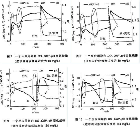 在(zai)氨氮(dan)沖擊(ji)濃度的(de)試驗中(zhong),維持污泥濃度在(zai)8 000 mg/L,進水(shui)混合液氨氮(dan)濃度分別(bie)為(wei):48、80、156、184 mg/L。好氧及缺/厭氧段的(de)反應(ying)時(shi)(shi)間是盡(jin)量使反應(ying)進行完全,為(wei)了探求ORP、DO、pH的(de)變化規律而沒有(you)采用(yong)實(shi)時(shi)(shi)控制。試驗結果見圖7~12。