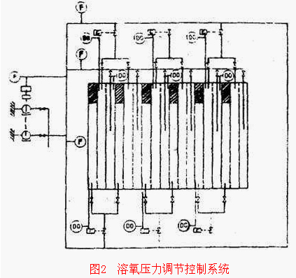 在設計控制系統時,指定DO值通常采用2mg/L,而在實際操作中不同控制區可用不同的DO指定值,但不得<15mg/L。控制系統的工作首先是由溶氧儀發出信號,啟動輸氣管上的閥門,氣量的變化使管網壓力變動,然后由壓力傳感器將信號送到鼓風機的進風葉片啟動器,調節氣量,使管網壓力達到最佳狀態。