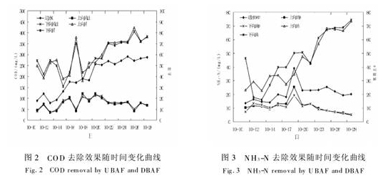 掛(gua)膜(mo)測試(shi)階(jie)段上(shang)向(xiang)流(liu)和(he)下向(xiang)流(liu)BAF兩濾柱的(de)NH3-N去(qu)(qu)除(chu)率隨(sui)時(shi)(shi)間(jian)變化情(qing)況(kuang)見圖2所示,在(zai)測試(shi)初(chu)期(qi)氨氮的(de)去(qu)(qu)除(chu)率較小,隨(sui)著運行時(shi)(shi)間(jian)的(de)增長,硝(xiao)化細菌在(zai)填料上(shang)逐漸富集和(he)并繁殖生(sheng)長,氨氮的(de)去(qu)(qu)除(chu)率在(zai)逐漸提高。但由(you)于(yu)由(you)于(yu)硝(xiao)化細菌本(ben)身的(de)增殖速度比較慢(man),溫度以(yi)及好氧有機物對硝(xiao)化菌生(sheng)長的(de)影(ying)響(xiang)。所以(yi)整個培(pei)養過程要比異養菌的(de)培(pei)養過程時(shi)(shi)間(jian)長。對于(yu)生(sheng)物膜(mo)法掛(gua)膜(mo)培(pei)養而(er)言,衡(heng)量生(sheng)物膜(mo)是(shi)否成熟,通常是(shi)以(yi)COD和(he)氨氮的(de)去(qu)(qu)除(chu)率達(da)到70%以(yi)上(shang)作為標志(zhi)。