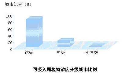 可吸入顆粒物(PM10)年均濃度達到二級標準及以上的城市占81.5%,劣于三級標準的占0.6%。山東、陜西、新疆、內蒙古、湖北、江蘇、甘肅、湖南等8省區參加統計的地級城市中PM10未達到二級標準的比例超過20%。