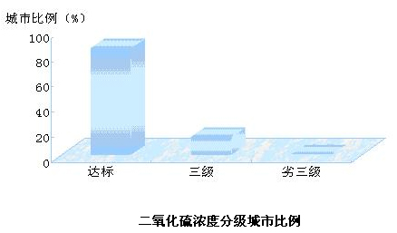 二氧化硫年均濃度達到二級標準及以上的城市占85.2%,劣于三級標準的占0.6%。貴州、山東、河北、山西、內蒙古、四川、湖南等7省區參加統計的地級城市中二氧化硫未達到二級標準的比例超過20%。