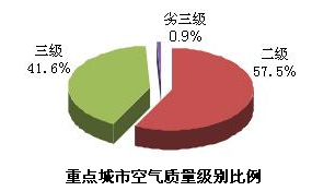重點城市 113個環境保護重點城市空氣質量有所提高,空氣質量達到二級標準的城市占57.5%,三級的占41.6%,劣于三級的占0.9%。與上年相比,達標城市比例上升了13.3個百分點;劣三級城市比例無變化。