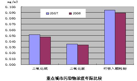 2008年環境保護重點城市總體平均的二氧化氮濃度與上年相比變化不大,二氧化硫和可吸入顆粒物濃度均有所降低。