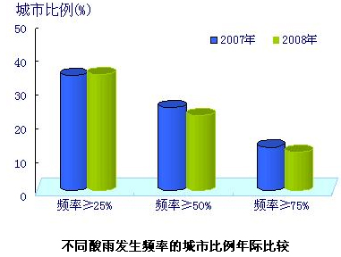 酸雨頻率 監測的477個城市(縣)中,出現酸雨的城市252個,占52.8%;酸雨發生頻率在25%以上的城市164個,占34.4%;酸雨發生頻率在75%以上的城市55個,占11.5%。
