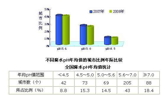 降水酸度 與上年相比,發生較重酸雨(降水pH值<5.0)的城市比例降低1.1個百分點,發生重酸雨(降水pH值<4.5)的城市比例基本持平。