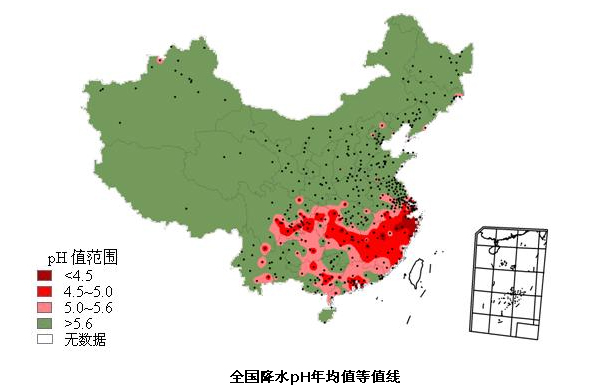 酸雨分布 主要集中在長江以南,四川、云南以東的區域,包括浙江、福建、江西、湖南、重慶的大部分地區以及長江、珠江三角洲地區。與上年相比,全國酸雨分布區域保持穩定。