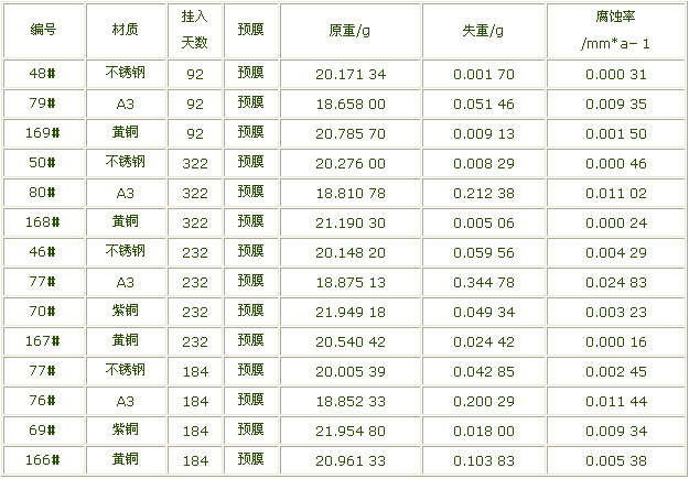 各種材料的平均腐蝕率與規范對照如下:碳鋼平均0.014 16 mm/a,規范要求0.127 23 mm/a,不銹鋼平均0.001 41 mm/a,規范要求0.005 09 mm/a,黃銅平均0.002 18 mm/a,規范要求0.005 09 mm/a,紫銅平均0.002 08 mm/a,規范要求0.005 09 mm/a。