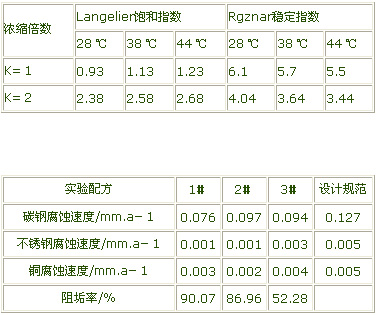 通常,穩定指數為5.0~6.0時,水是結垢型水;穩定指數為3.5~5.0時,水嚴重結垢。由表1可以看出,冷卻水采用直流供水時為結垢型水,而當濃縮倍數提高到2.0時,冷卻水嚴重結垢,而且結垢的趨勢隨溫度的升高而加重。