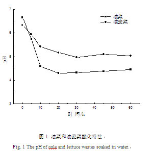 圖1為油菜和油麥菜酸化過程中的pH變化規律。由圖1可知在酸化處理30h左右,油菜和油麥菜的pH均降到最低,之后曲線基本趨于平緩,至60h時仍沒有明顯變化,為了保證徹底酸化,確定60h為后續實驗的酸化時間。