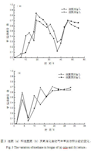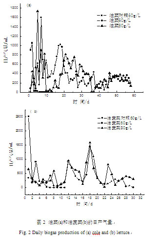 (1)經過兩步批次處理,油菜和油麥菜的產氣性能與對照比較都得到極大提高,油菜在60和80 g/L的有機負荷率下日平均產氣量分別為360mL/d和352mL/d,即0.24L/ (d·L)和0.23 L/ (d·L);油麥菜分別為314mL/d和417mL/d,即0.21 L/ (d·L) 和0.28 L/ (d·L)。