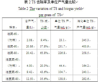 厭氧消化前后TS的去除率及單位TS的產氣量見表2。在總產氣量、TS去除率、單位TS產氣率和消化單位TS產氣量,油菜和油麥菜在60和80 g/L的有機負荷率下都較對照有明顯的提高,其中以油菜產氣量的提高最為顯著,總產氣量都較對照提高了9倍左右,TS減少量由9.4%提高到了57.8%和65.8%。油麥菜的產氣狀況不如油菜的好,可能與其成分有關,但是其單位TS產氣率仍然達到了104.7和138.9mL/g,遠遠優于對照實驗。