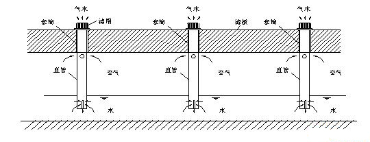 氣沖:打開進氣閥,開啟供氣設備,空氣經氣水分配總渠的上部小孔均勻進入濾池濾板底部,由長柄濾頭噴入濾層,將濾料表面雜質擦洗下來并懸浮于水中,再由表面漂洗水沖入排水槽。