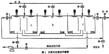 中間階段的作用是完成曝氣池到沉淀池的轉換。在第一主階段的中間階段,污水進入B池,C池仍處于沉淀出水狀態,同時A池開始進入沉淀狀態,為出水作準備。在第二主階段的中間階段,污水進入B池,A池仍處于沉淀出水狀態,同時C池開始進入沉淀狀態,為出水作準備。