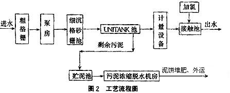 原污水進入格柵間,在此攔截污水中飄浮物,由污水泵提升,經細格柵進一步去除水中雜質,進入沉砂池去除砂粒,然后進入UNITANK池,去除BOD5等污染物,混合液經沉淀分離,澄清液進入接觸 池加氯消毒(季節性)后排入汪洋溝。剩余污泥經污泥泵送至集泥池,由帶預濃縮功能的脫水機處理 后,泥餅外運。工藝流程如圖2所示: