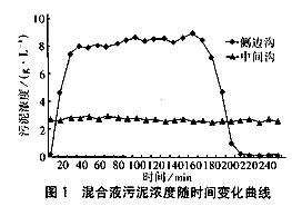 利(li)用便(bian)攜式光電污(wu)泥濃度儀(測(ce)量(liang)精度為(wei)0.1 mg/L)對氧化溝(gou)(gou)正在(zai)運行的側(ce)邊溝(gou)(gou)(另一(yi)側(ce)邊溝(gou)(gou)正處于澄清狀(zhuang)態)和中間溝(gou)(gou)混合液連續采樣(yang)分析。由于三溝(gou)(gou)式氧化溝(gou)(gou)運行具有(you)的對稱性(xing),只進行半個運行周期(14h)的取樣(yang)分析即可(ke)。每隔(ge)10 min進行一(yi)次測(ce)量(liang),采樣(yang)點固定在(zai)液面下1m。試驗結果見圖1。