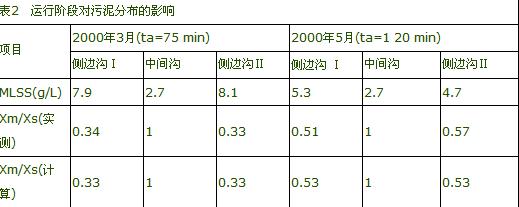 2000年(nian)2月和(he)4月,分(fen)別把(ba)反硝化階段(duan)的(de)時間改為(wei)75 min和(he)120 min。穩(wen)定運行一個(ge)月后,測定各溝(gou)的(de)污泥濃(nong)度(du),結(jie)果見表2。