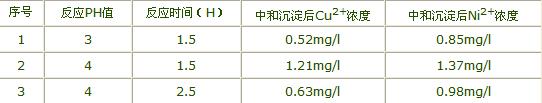 注:在酸性溶性中:HOCl+H++2e→Cl-+H2O,E=1.49V;在堿性溶性中: OCl-+H2O+2e→Cl-+2OH-,E=0.9V;在中性溶液中,E=1.2V,經多次試驗發現,其絡合廢水中的Cu2+ 、Ni2+濃度隨氧化反應的時間及酸度成正比,反應時的PH值越低,反應時間越長,則處理效果愈好。如表2所示.