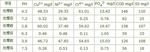 廢水經處理后達到需達到《國家綜合污水排放標準》(GB8978-1996)之一級標準。即Cr6+≤0.5mg/l,Cu2+≤0.5mg/l,Ni2+≤1.0mg/l,PO42-(以P計)≤1.0mg/l,CODCr≤100mg/l,SS≤70mg/l