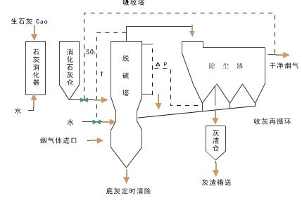 從鍋爐出來的含塵和SO2的煙氣,從脫硫塔的底部經過文丘里管上升,進入塔內。生石灰(CaO)在消化器內加水消化后,在消石灰倉內儲存。將一定量的消石灰和水在文丘里喉口上端加入,在脫硫塔內與煙氣混合流動,并與煙氣中的SO2 反應,生成亞溫度,進入后部的電除塵器或布袋除塵器。反應產物和煤灰被除塵器收下后,通過空氣斜槽返回塔內,再次循環參與脫硫反應時間,消石灰的作用得以充分發揮,用量減少,同時脫硫效率得以提高。