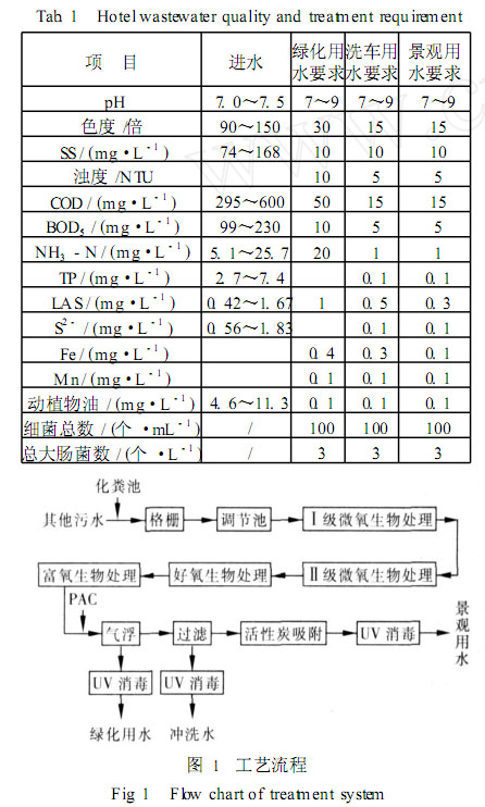 沈陽某酒店為一家涉外五星級高級賓館,建筑面積近20×104m2,設有接待大樓、會議及娛樂大樓,并建有室內游泳池。該賓館污水量為1200m3/d。處理后污水回用作賓館的綠化澆灌水、地面沖洗水、車輛沖洗水、非接觸風景景觀用水等。按照建設綠色賓館的要求,處理后的水質應優于不同用途的回用水水質要求。