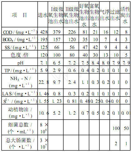 ①采用一體化微氧、好氧、富氧生物處理與后續氣浮、過濾、活性炭吸附及UV消毒優化組合工藝對賓館污水進行處理,效果良好,出水水質優于國家一級排放標準,并達到污水的多目標回用要求。氣浮出水可滿足綠化用水的要求,過濾出水可滿足地面沖洗水、車輛沖洗水的要求,活性炭吸附罐深度處理出水可滿足景觀用水的要求。
