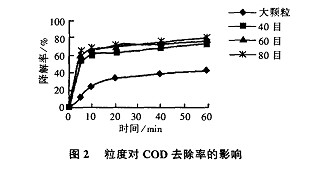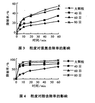 活性炭因具有豐富的孔徑分布和很大的比表面積而且有很強的吸附能力。試驗表明,活性炭粒徑減小可明顯提高焦化廢水的處理效果。分散的活性炭對COD、氨氮、酚和氰化物都有很好的去除效果。這可能是由于顆粒度決定了比表面積。研磨后的活性炭粒度變小,可以更充分發揮粉末活性炭微孔、中孔的作用,并且路徑比顆粒活性炭短,加快了傳質過程。另外活性炭粒徑變小后,活性炭接觸焦化廢水的表面積增大,吸附性能提高。但活性炭粒徑并不是越小越好,因為粒徑越小,活性炭的成本越高,同時容易凝聚,再生也困難。