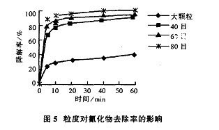 活性炭對氰化物的去除率如圖5所示。80目的去除率為100%,柱狀活性炭的去除率最低。80目、60目、40目的處理效果在1h后非常接近。