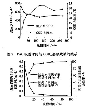 從圖2、圖3可以看出,隨吸附時間的延長,COD和陽離子表面活性劑均呈下降趨勢.PAC對COD。的吸附在120—150min達到平衡點,隨后COD。去除率稍有下降并穩定在25%一30%.吸附去除陽離子表面活性劑速度較快,40~60min即可達到吸附平衡,吸附80min后99%的陽離子表面活性劑得到去除,這說明PAC對以陽離子表面活性劑為代表的毒害物質選擇性吸附較好,去除效果理想