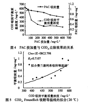 隨著PAC投加量的增大,COD吸附平衡濃度逐漸下降,同時PAC對COD吸附量也呈下降趨勢.出于經濟方面的考慮,試驗控制PAC最大投加量為600ms/L,但從整體趨勢來看,繼續增大PAC投加量,COD。去除率還可進一步提高.將試驗數據整理進行Freundlich吸附等溫線擬合,可得試驗溫度下PAC對COD。的吸附等溫式: