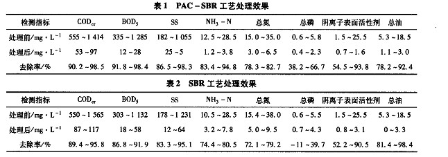 PAC—SBR工藝與SBR工藝處理效果分別見表1、2.