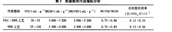 實驗期間PAC—SBR工藝和SBR工藝均未出現明顯的污泥膨脹等不良現象,但SBR池面泡沫現象仍比較重.對于投加PAC對泡沫現象改善作用的機理目前還沒有定論,實驗期間污泥指標參數如表3所示,