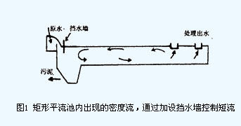 渦流是矩形平流沉淀池內不可避免的干擾流。由于導水墻的摩擦作用,以及流態不穩等原因,懸浮顆粒偏流,降低了沉淀除去效果。如果沉淀池太寬,可加設導流墻,提高水流穩態。