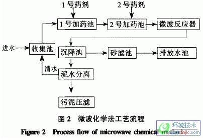 微(wei)波(bo)(bo)化學(xue)法(fa)處(chu)理(li)廢(fei)水(shui)工藝是近(jin)幾年(nian)發展(zhan)起來的(de)一種(zhong)新(xin)型廢(fei)水(shui)處(chu)理(li)工藝。它利用了微(wei)波(bo)(bo)特有的(de)物(wu)理(li)、化學(xue)、生物(wu)學(xue)效應(ying),配合多(duo)種(zhong)化學(xue)藥劑,完成對有機(ji)污(wu)染物(wu)的(de)氧化、分解、吸附、混(hun)凝等(deng)作用。該方法(fa)工藝流程如圖2所示。